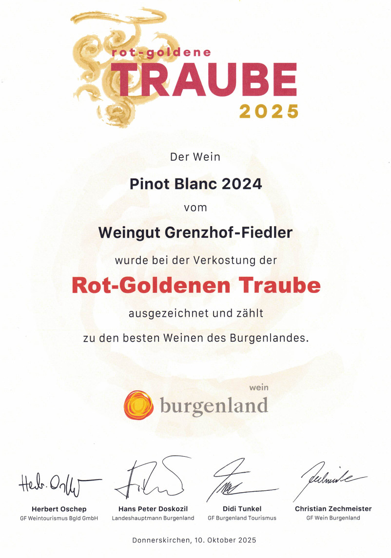 Die Jury der Rot-goldenen Traube Burgenland sieht das genau so und zählt unseren Pinot blanc 2024 zu den besten Weinen des Burgenlandes.